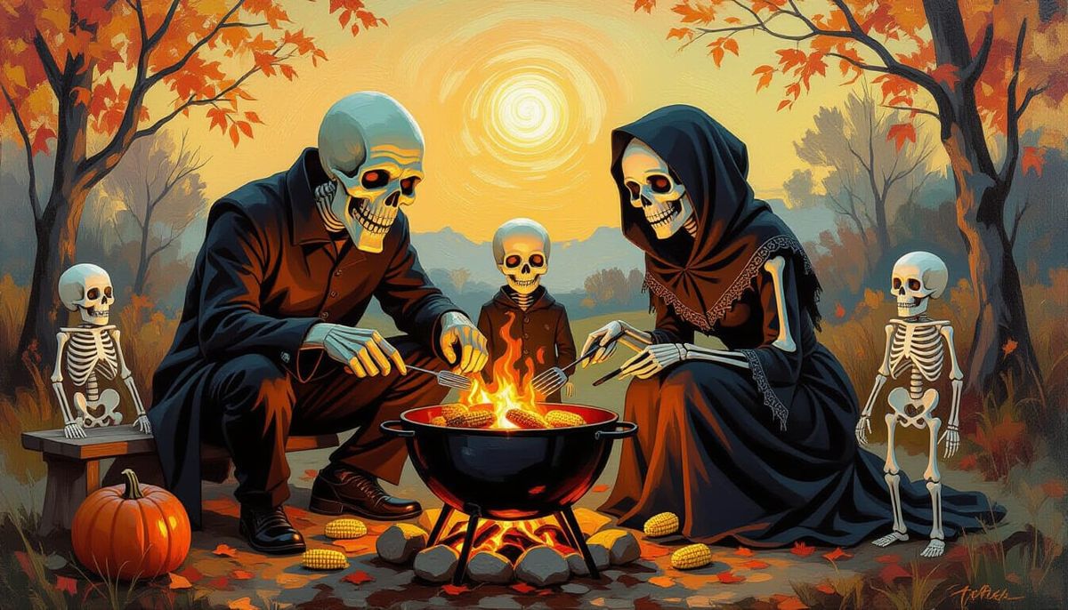 This impasto oil painting depicts a ghoul family and skeleton boy barbequing corn by a glowing pit. Miniature skeletons stand guard in a warm, earthy autumnal scene.