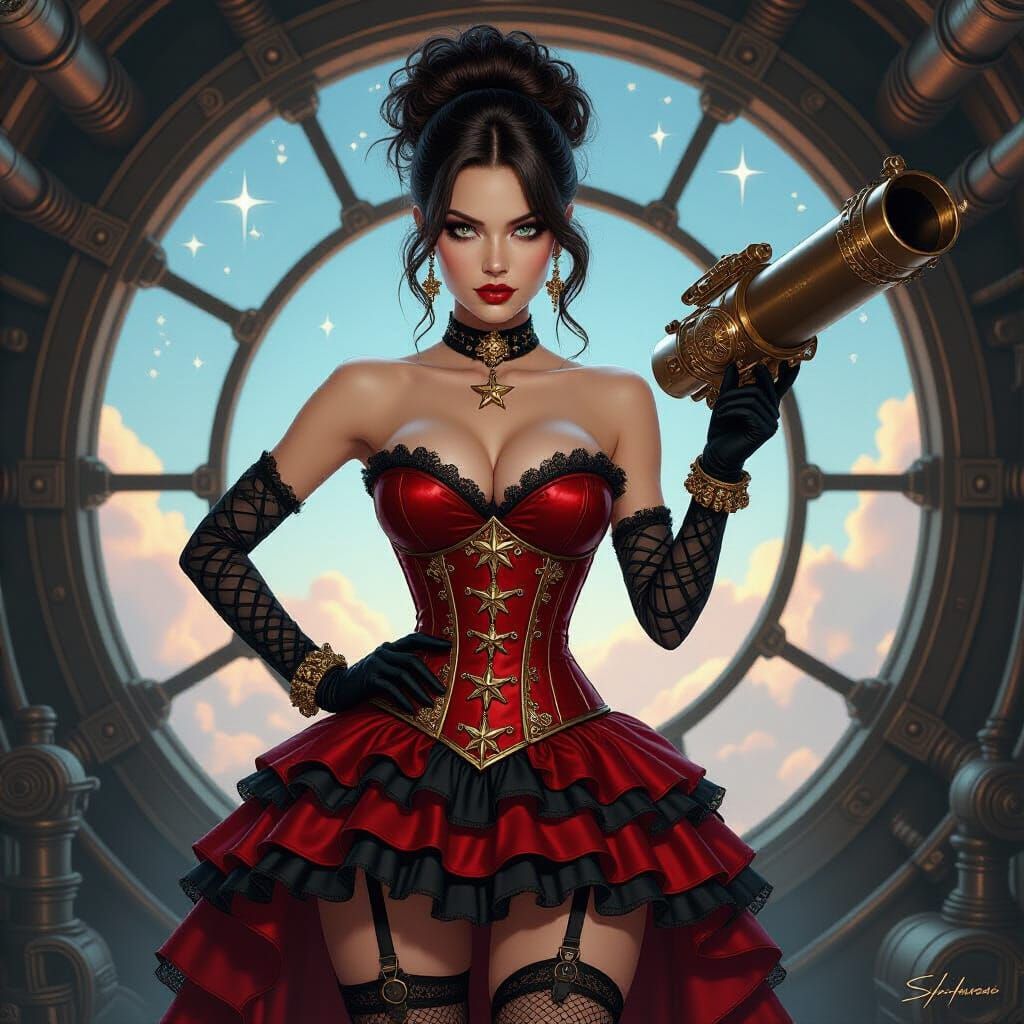 A photorealistic cinematic artwork of a powerful steampunk heroine, exuding sensual dynamism. She has porcelain skin, fierce blue eyes, and dark tousled hair in a messy updo, framed by bold makeup with razor eyeliner and vivid pink lips. She wears a deep crimson corset with gold filigree and black lace ...