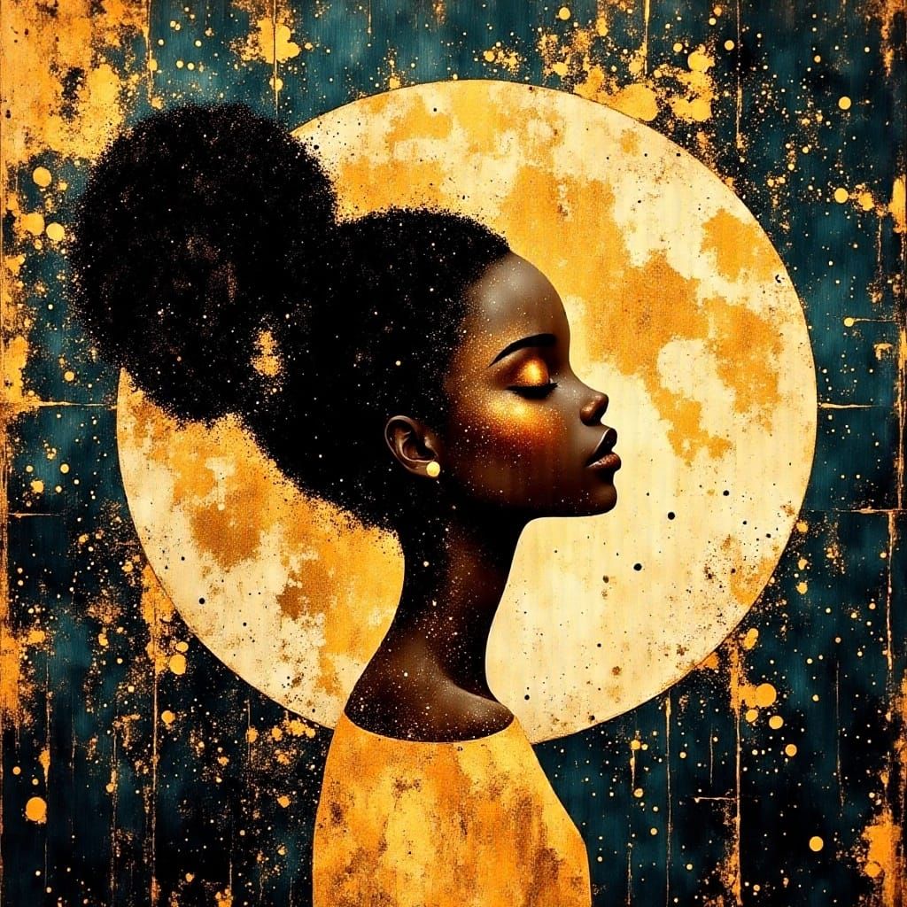 This image shows a beautiful African woman bathed in moonlight. The artwork features a kintsugi aesthetic, reminiscent of Gustav Klimt's style, with surreal and ethereal elements.