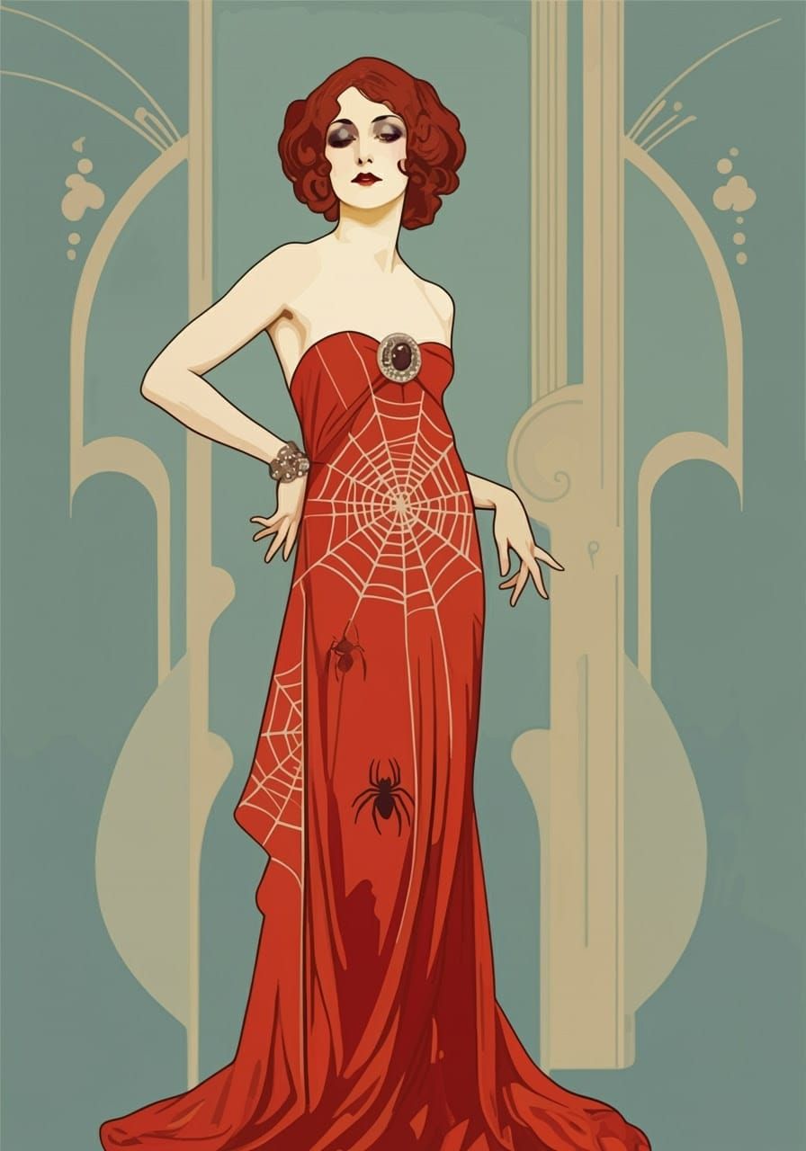 This image shows a glamorous woman in a striking red spiderweb dress. The artwork evokes an Art Deco aesthetic with geometric patterns and dramatic makeup.