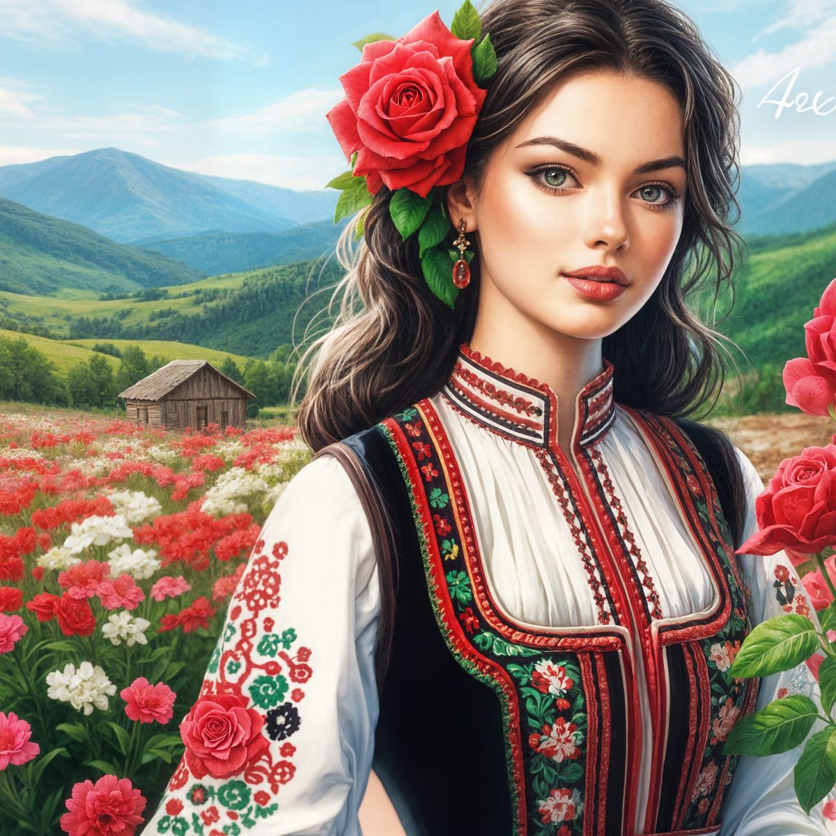 This image showcases a portrait of a beautiful Bulgarian woman. The AI-generated artwork captures her likeness with detailed features and a naturalistic style.