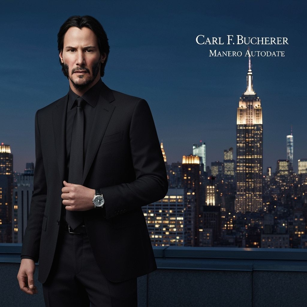 This image shows a Keanu Reeves doppelganger in a black suit. He's on a rooftop at twilight in New York City, displaying a silver Carl F. Bucherer watch. The scene has a luxurious and cinematic aesthetic.