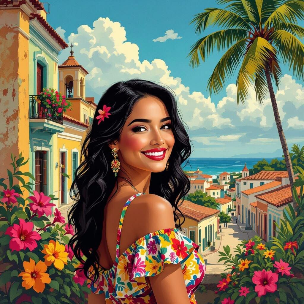 This image shows a smiling Cuban woman with black hair and traditional colorful clothing. Behind her is a vibrant Cuban landscape with colonial architecture, palm trees, and tropical flowers. The artwork features warm colors and rich textures.