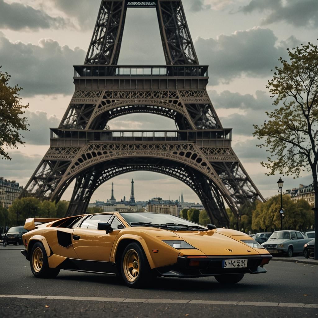 This image shows a Lamborghini Countach parked next to the Eiffel Tower as dusk settles. The scene is presented with cinematic lighting and atmospheric effects, reminiscent of a film still.