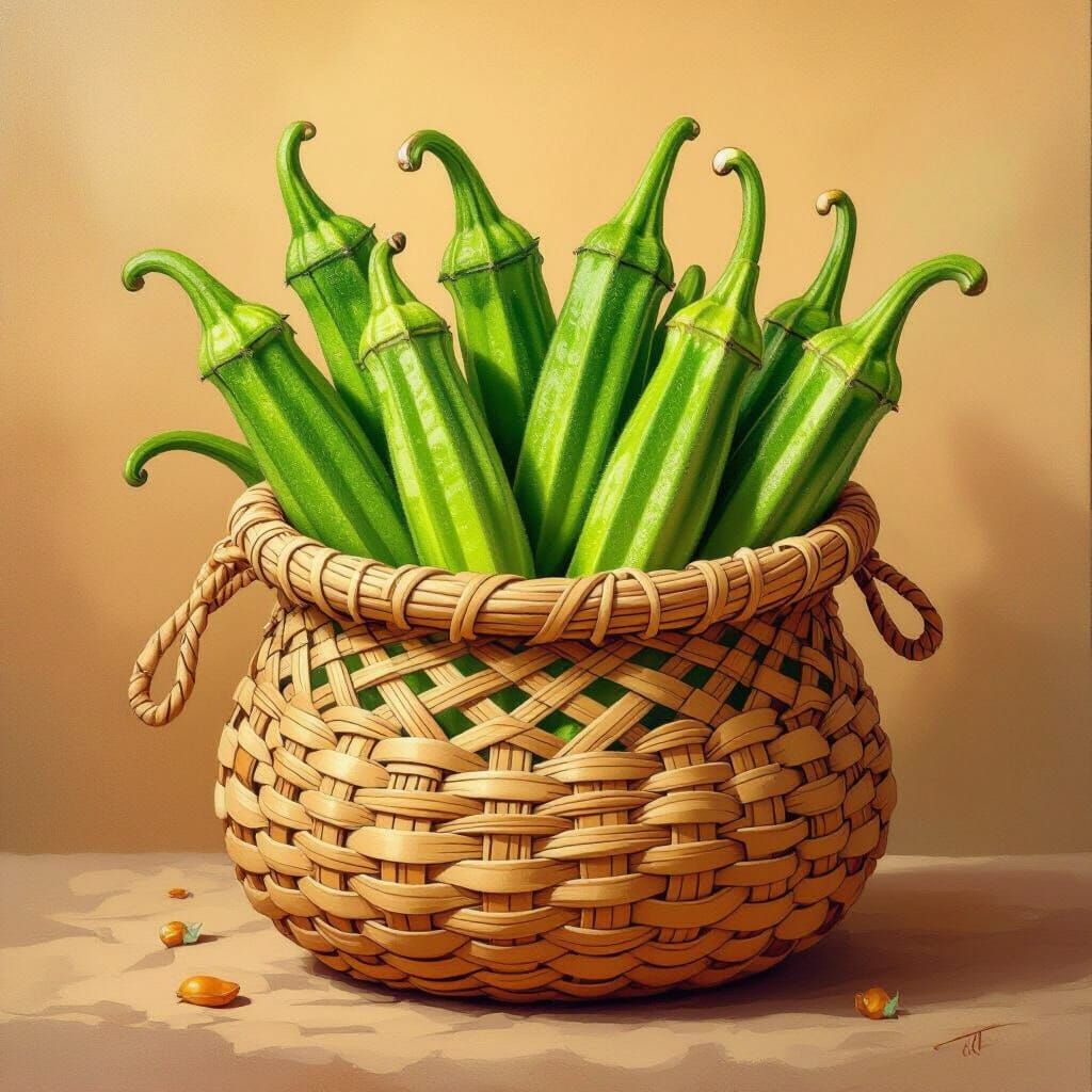 A striking picture of vibrant okra pods arranged in a woven pouch. The still life composition features delicate lighting and soft textures, reminiscent of illustrative realism.