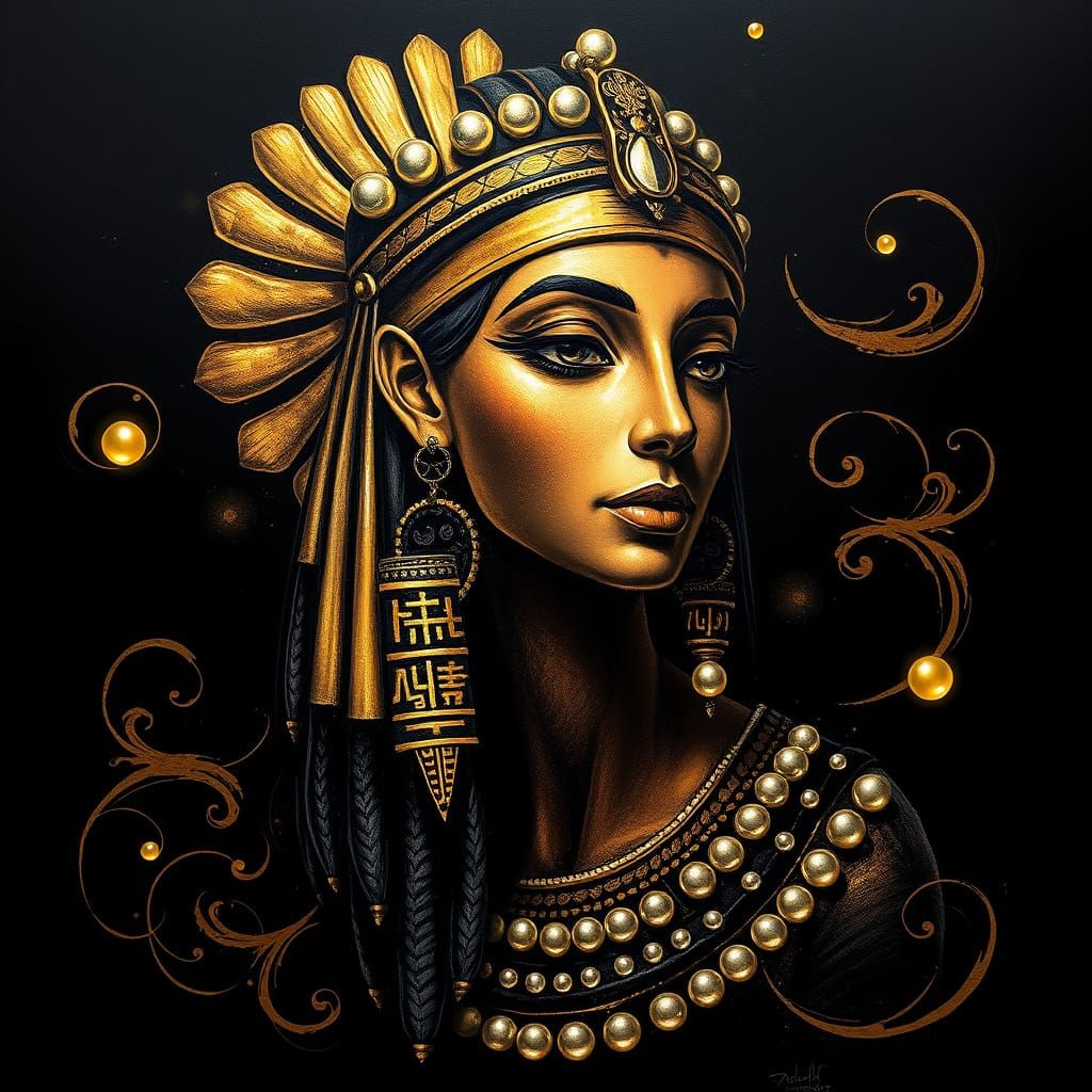 A drawing of an Ancient Egyptian girl with dynamic shadows and iridescent pearls. The artwork features surrealist elements and a color palette of golds and silvers.