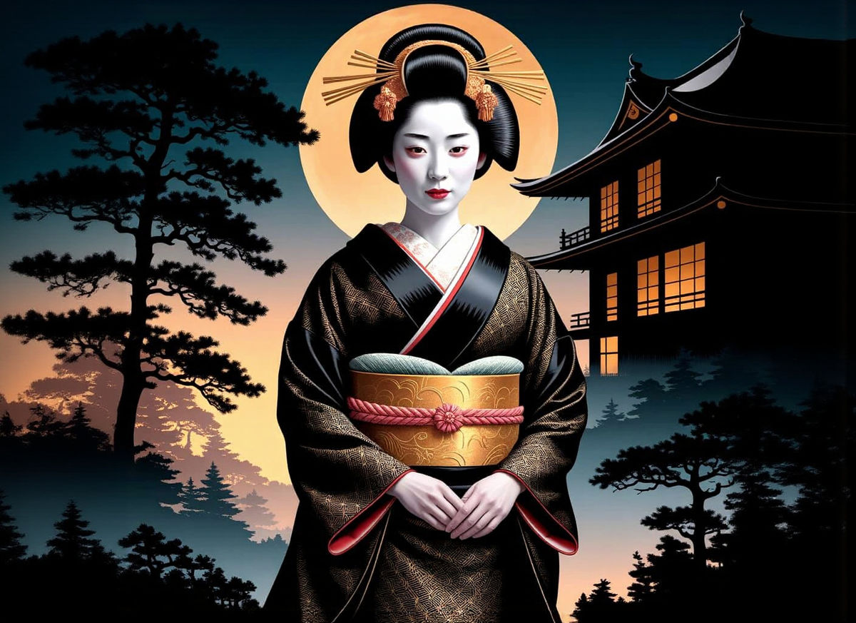 A striking picture of a young Japanese geisha in a black and gold kimono. Warm lighting highlights her serene expression, with a traditional home silhouetted against a moonlit forest in the background, in the style of oil painting.