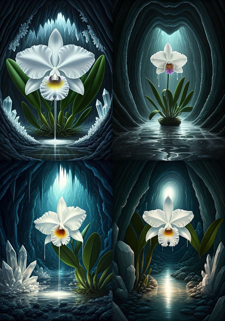 This hyperrealistic digital painting features a white Cattleya Warneri orchid blooming in a luminous crystal cave. Intricate details and glowing geodes create an atmosphere of alien beauty and quiet mystery.