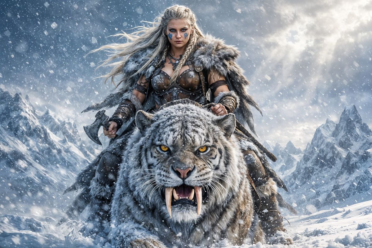 A photorealistic depiction of a fierce Nordic shield-maiden warrior with icy-blonde hair and war paint, riding a colossal saber-toothed tiger. The scene is set in a cinematic, epic fantasy style.