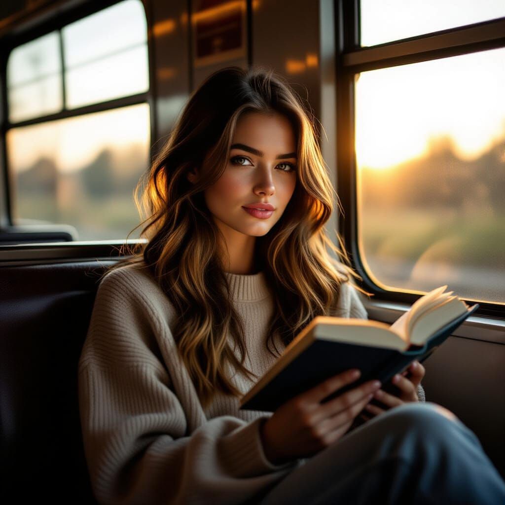 This photorealistic image captures a relatable young woman reading on a train during the golden hour. Natural light and cinematic lighting create a soft, intimate atmosphere.