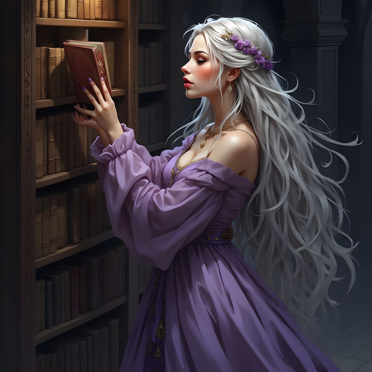 This image shows a goddess with long silver hair and a violet dress reaching for a book in a shadowy library. The style is reminiscent of classic fantasy art.
