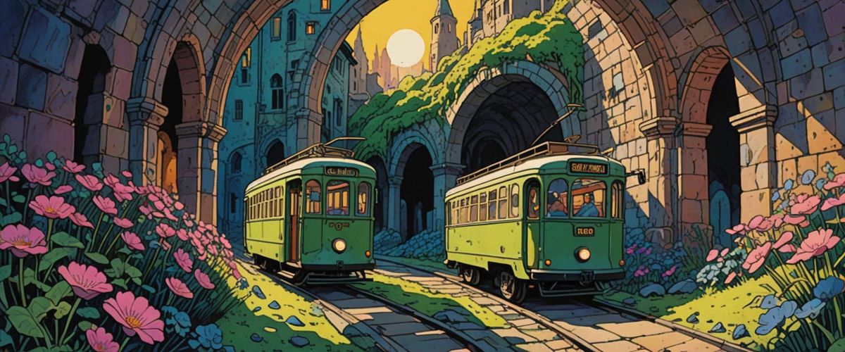 This image shows a trolly car in a vast underground city. Sunlight filters through stone arches illuminating magenta flowers and vibrant moss. The artwork is reminiscent of a comic book aesthetic.