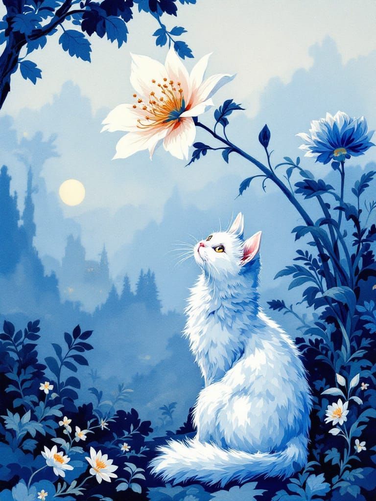 This image features an adorable cat beneath a tall flower, rendered with the atmospheric depth of Hiroshige, linear precision of Ingres, and Delft pottery's delicate narrative. It showcases luminous transitions and precise linework.