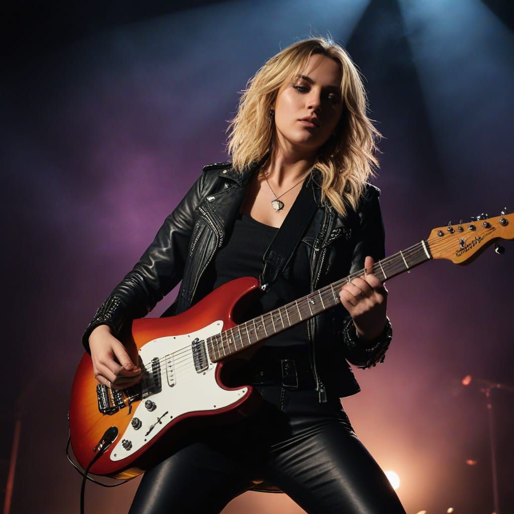 A medium shot of a blonde female rockstar on stage with an electric guitar. She's illuminated by spotlights, wearing a leather jacket, and exuding confidence in a high-energy scene.