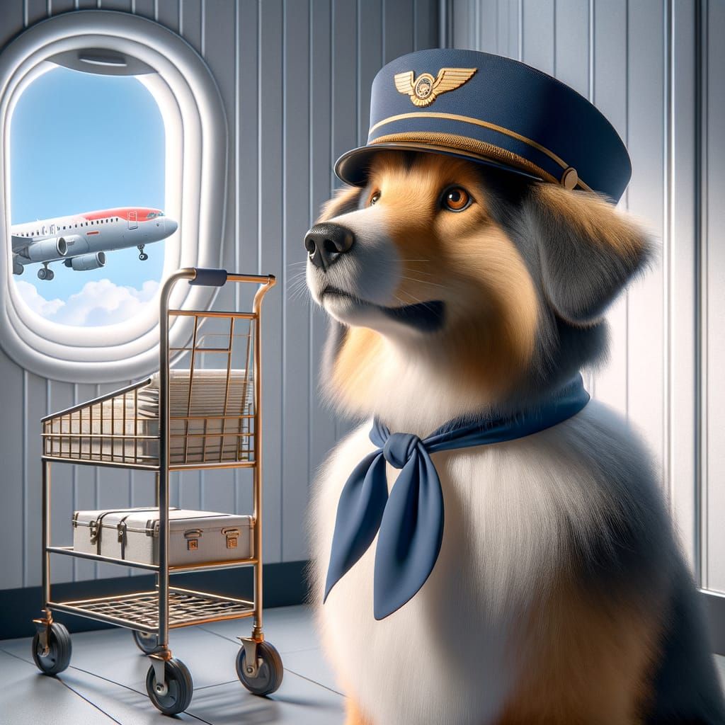 A hyperrealistic image of a well-mannered Pooshon dog dressed as a vintage flight attendant, complete with cap and scarf. The dog stands beside an aircraft trolley, with a plane visible through the window in this vibrant concept art.