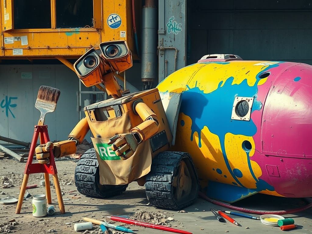 A whimsical image of Wall-E as a painter decorating a spaceship. This HDR oil painting style artwork features rich textures, dynamic lighting, and a high contrast aesthetic.
