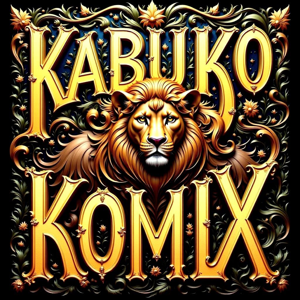 This image features a regal lion in an Art Nouveau style, inspired by Alphonse Mucha's elegant lines and decorative elements. The words 'KABUKO KOMIX' are incorporated into the design.