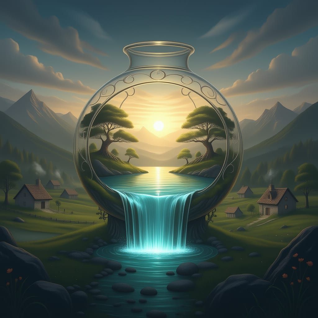 This image depicts a hyper-realistic lamp containing a detailed natural lake that spills out into a dramatic, cinematic landscape with rolling hills and houses.