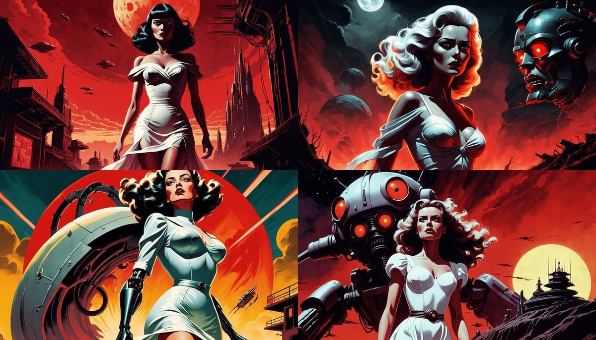This image shows a menacing robot with glowing eyes carrying a distressed woman in a flowing white dress against a stark red background, evoking a sense of 1950s sci-fi horror