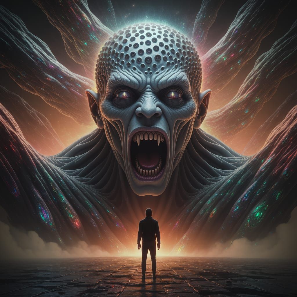 This haunting image depicts a gargantuan eldritch horror, surrounded by swirling chaos and distorted universes, with a human figure screaming in terror before it. The scene is bathed in warm, high-contrast lighting with deep shadows and radiant highlights, set against a distressed biomechanical backgroun...