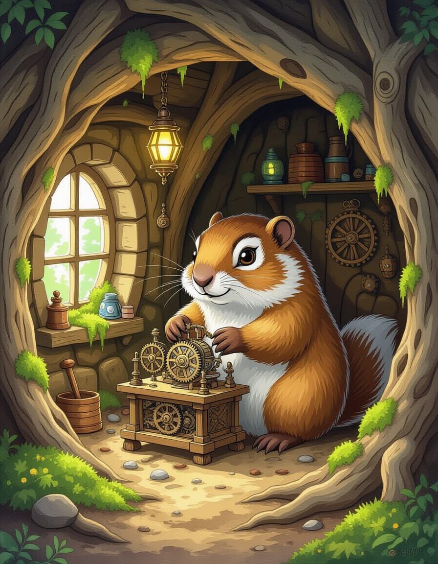This image shows a whimsical groundhog building a clockwork toy in a burrow filled with roots and glowing moss. Features detailed fantasy illustration with earthy watercolors.