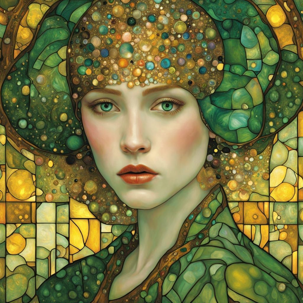 This enchanting image features a woman with luminous green eyes and intricate details, set against a mystical backdrop with a dreamy, ethereal atmosphere and vibrant colors reminiscent of stained glass.