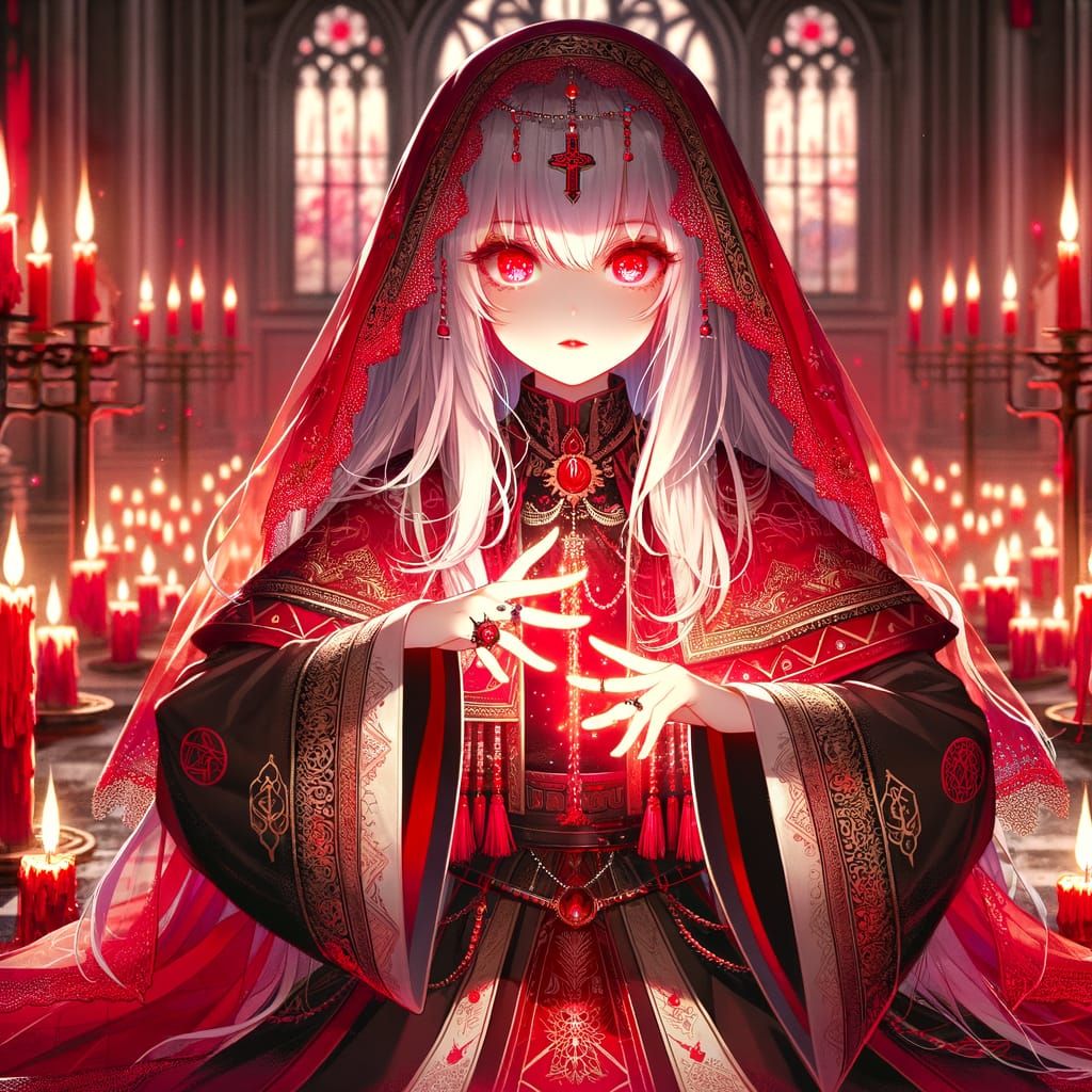 This image shows an intriguing Asian priestess performing an ancient ritual in a red-lit cathedral. Her glowing white hair and crimson eyes radiate power, with intricate ceremonial garments and dancing energy. Created in a detailed anime style with gothic ambiance.