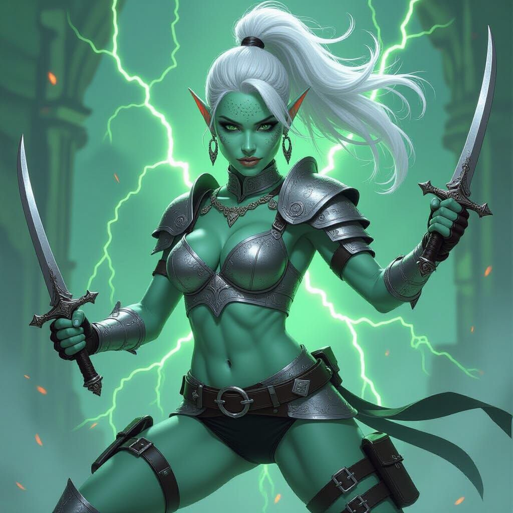 A striking picture of a dark elf woman with gray skin and silver armor, wielding daggers amidst bright green magical effects. The image is rendered with intricate textures in a fantasy art style.