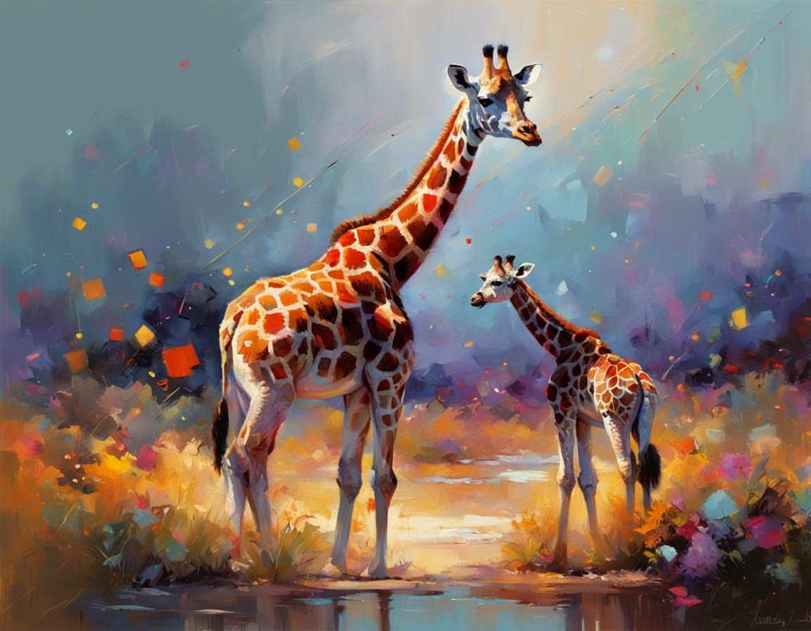 This image shows a baby giraffe in a colorful African landscape, captured in a realistic oil painting style with a focus on cuteness and luminosity.
