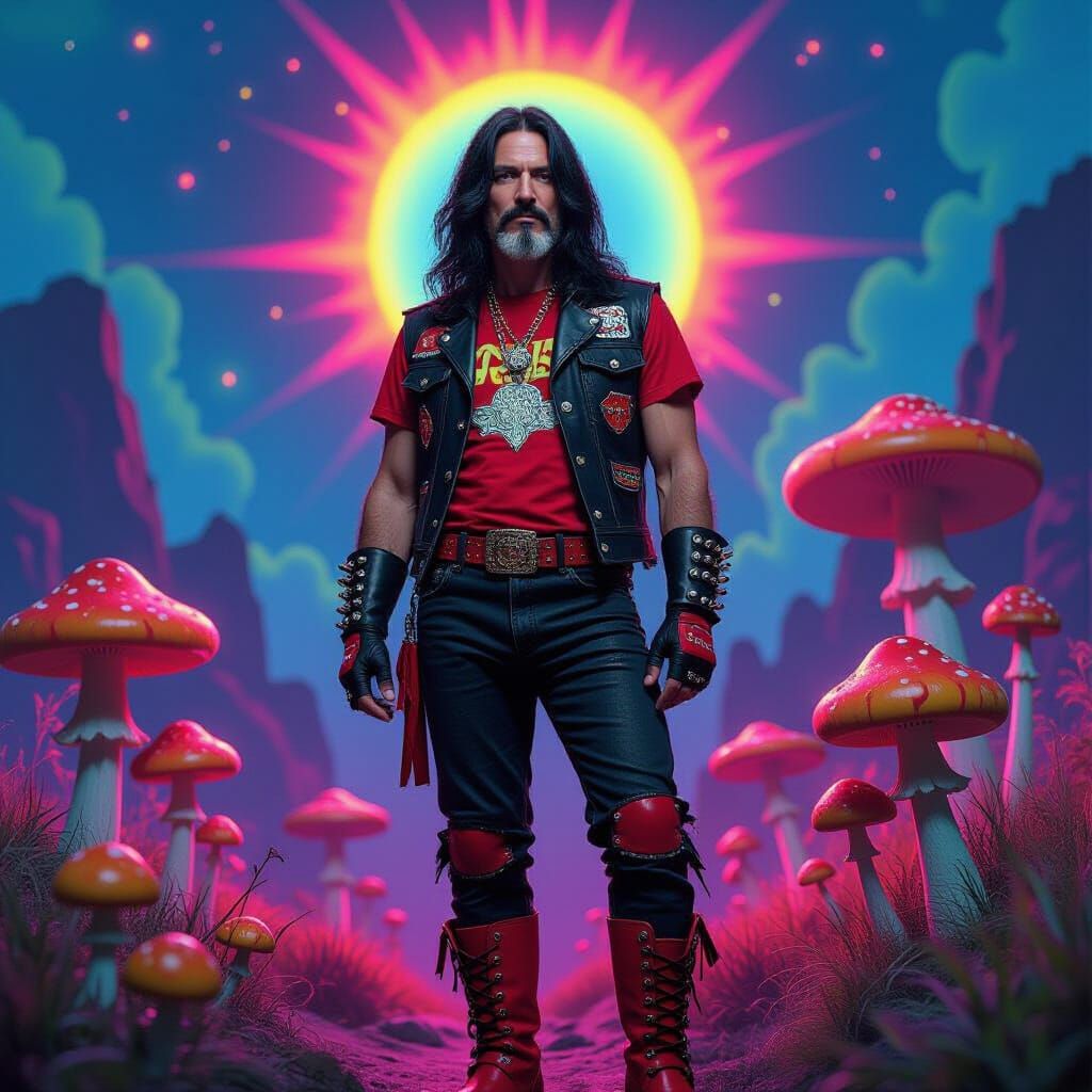 A striking picture of a man with long black hair and a grey beard, dressed in rock-and-roll attire. The image is rendered in a hyper-psychedelic pop art style with vibrant neon colors and surreal landscape elements.