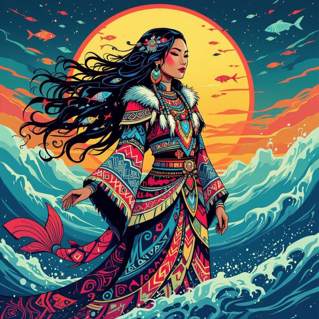 This striking image depicts Sedna, the Inuit Sea Goddess, with hair transforming into fish. Rendered in a bold poster art style with retro gradients and graffiti glow.