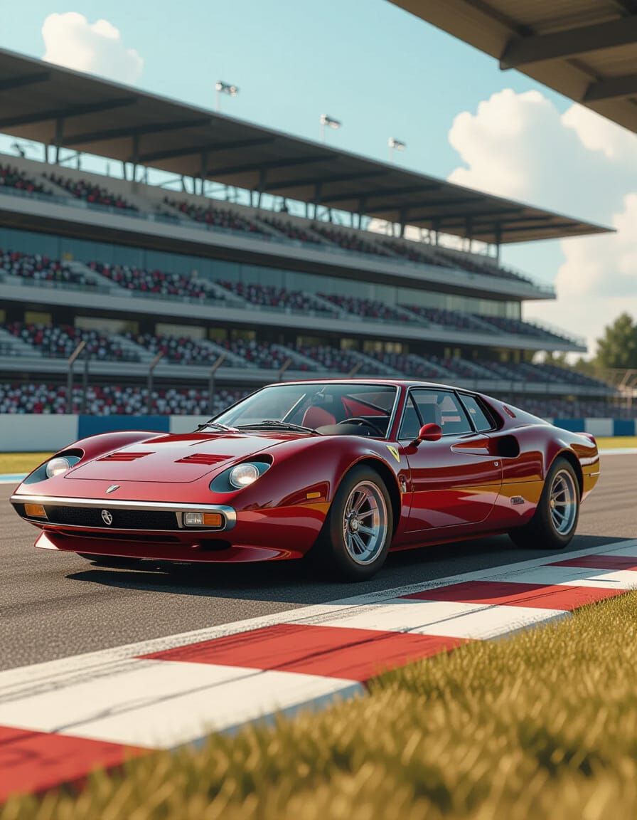 This image showcases a sleek, concept art style sports car blending 1970s Lancia design with modern flair. Its glossy metallic wine red finish reflects dynamic lighting on a race circuit paddock.