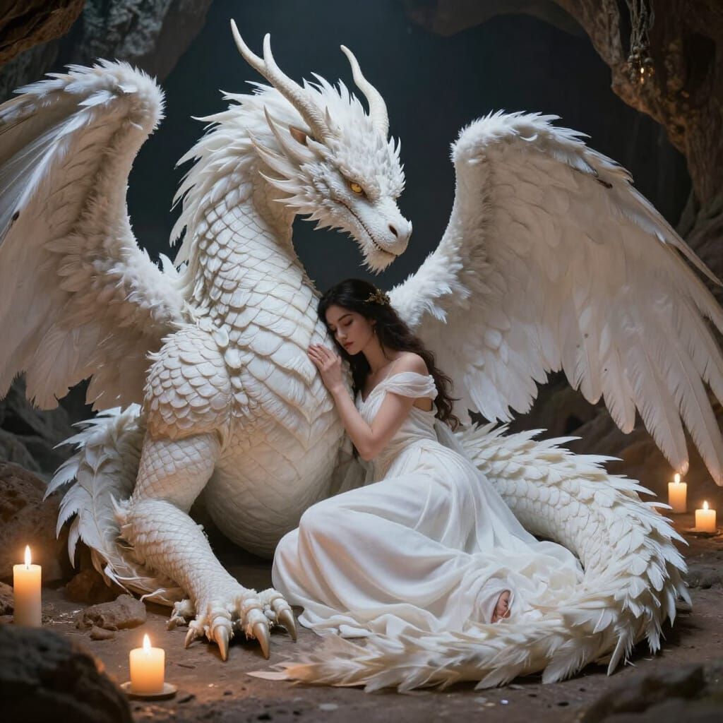 This image shows a majestic white feathered dragon and a beautiful angel resting together in a cave. Warm candlelight illuminates their scales and feathers, creating a sense of enchantment.
