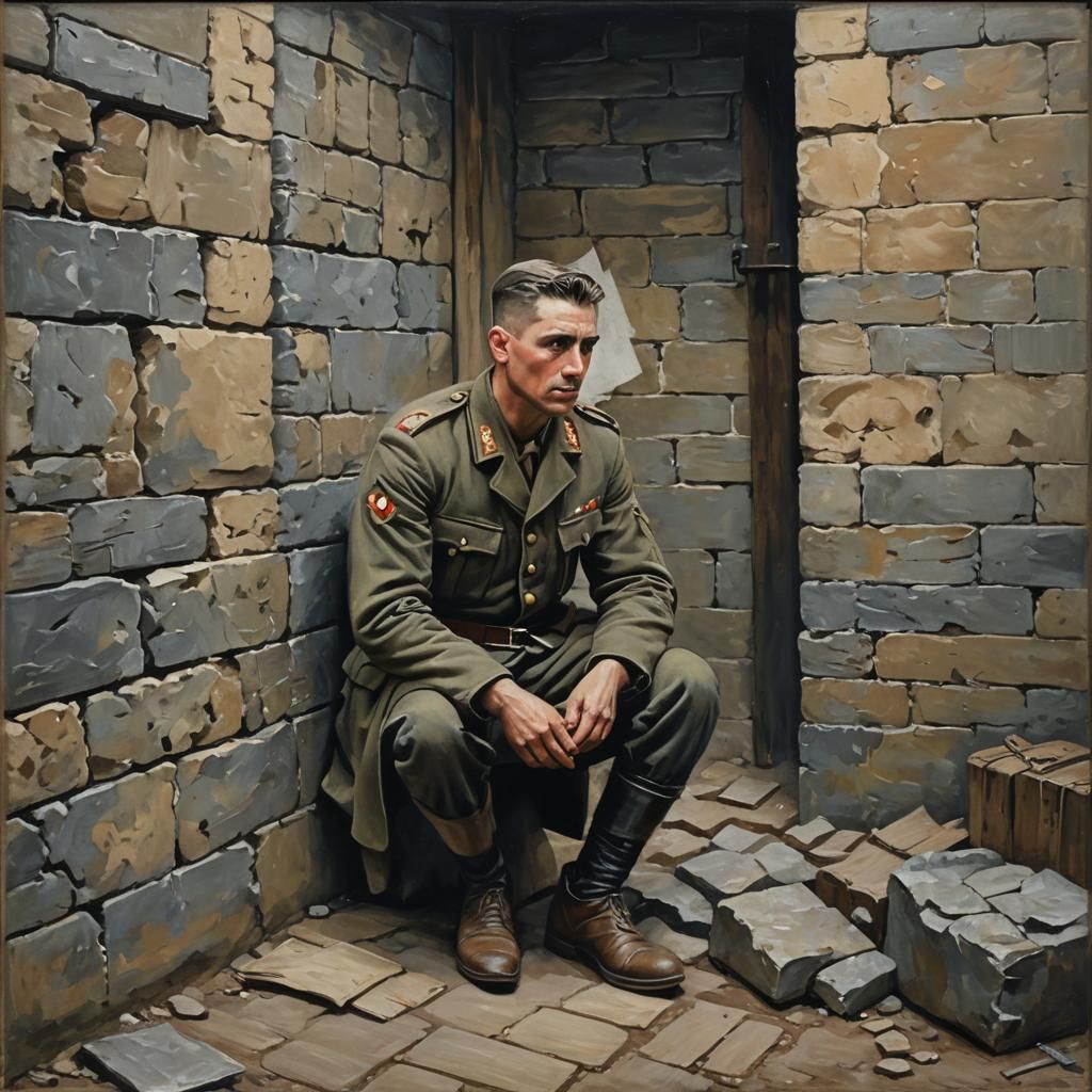 This image shows a British soldier in a World War I German prison camp. Rendered in impressionist gouache style, the artwork features thick brushstrokes, muted colors, and visible canvas texture.