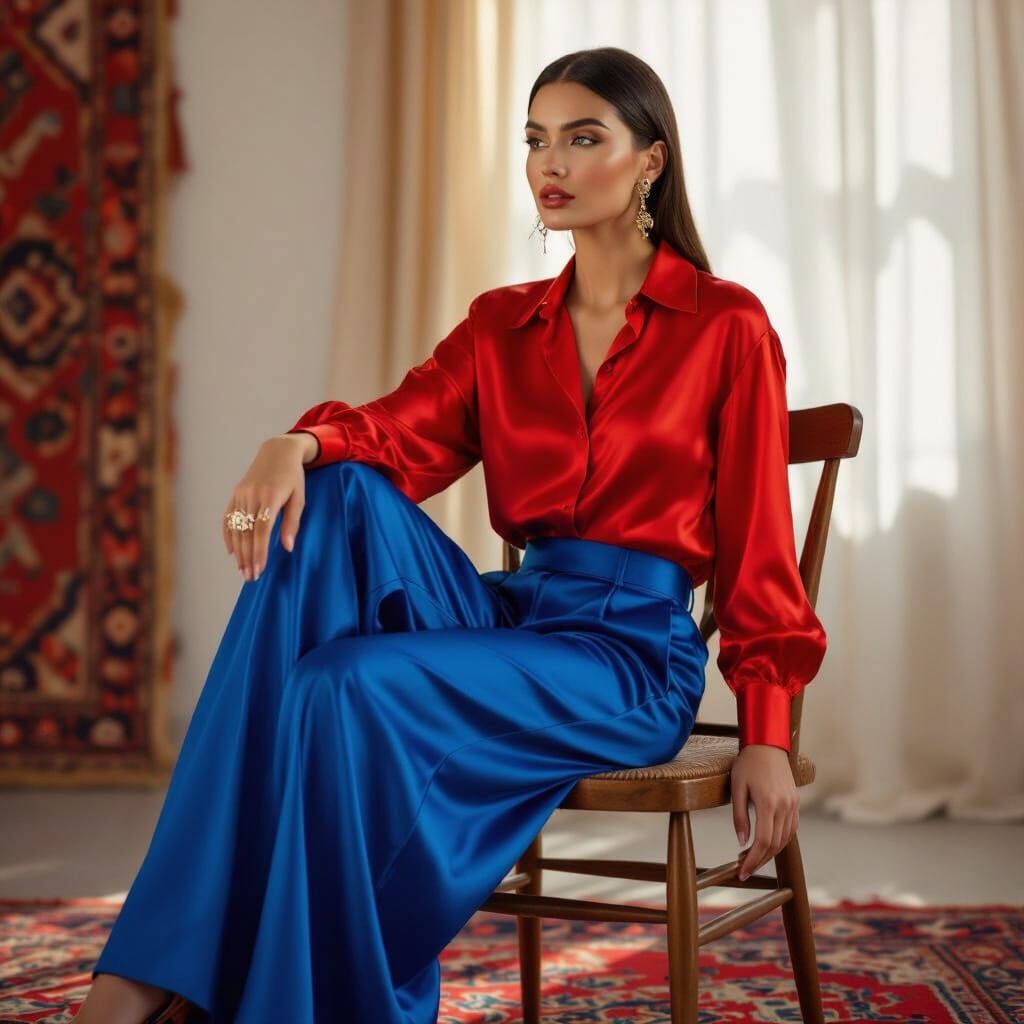 This image captures a stylish woman in a vibrant red satin shirt and blue trousers, seated on a wooden chair. Photorealistic studio photography with soft lighting and a blurred carpet background creates an elegant, cinematic feel.