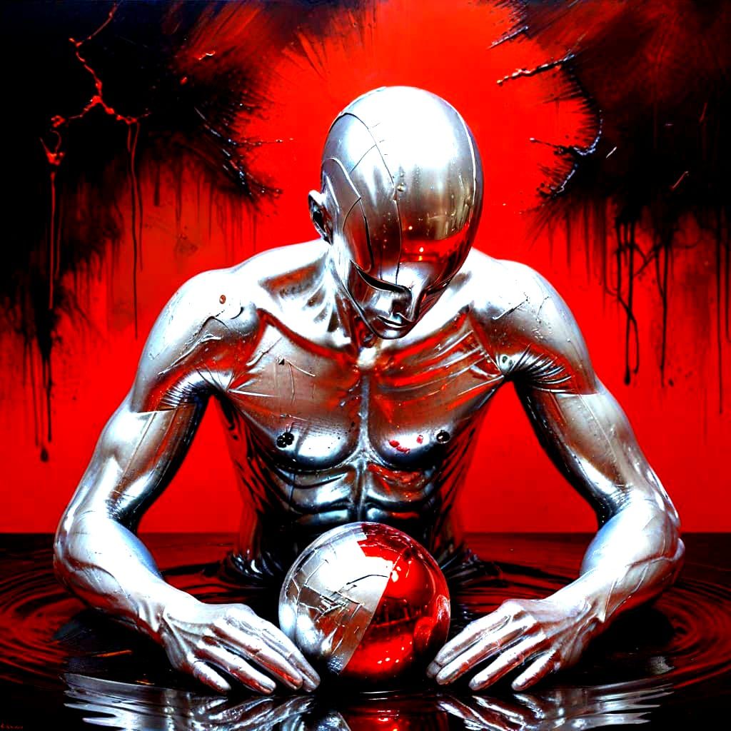 This image shows a figure entirely covered in crumpled silver foil, seated on red. The figure's head is a sphere of foil, with hands in boiling resin.