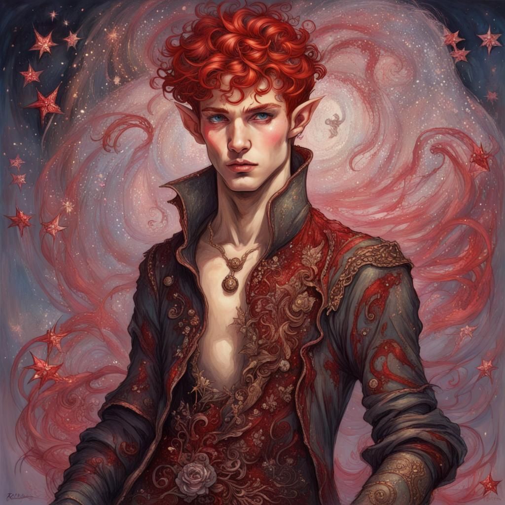 A digital painting of a beautiful elf surrounded by an explosion of red glitter. The art has a rococopunk aesthetic, reminiscent of classical painting techniques.