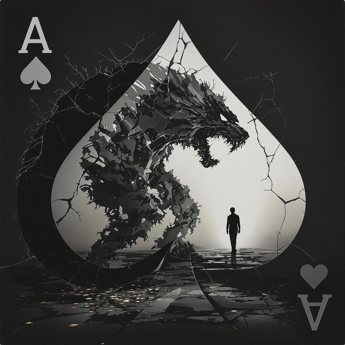 This image shows a striking anime monster silhouette in double exposure. A portrait Ace of Spades playing card is detailed and shrouded in darkness, set in a dystopian wasteland as digital art.