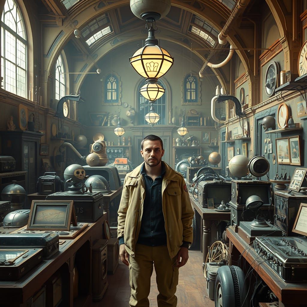 A digital painting shows a figure surrounded by vintage artifacts in a grand museum. The image has a nostalgic atmosphere, blending futuristic and vintage elements in a retro-futuristic style.