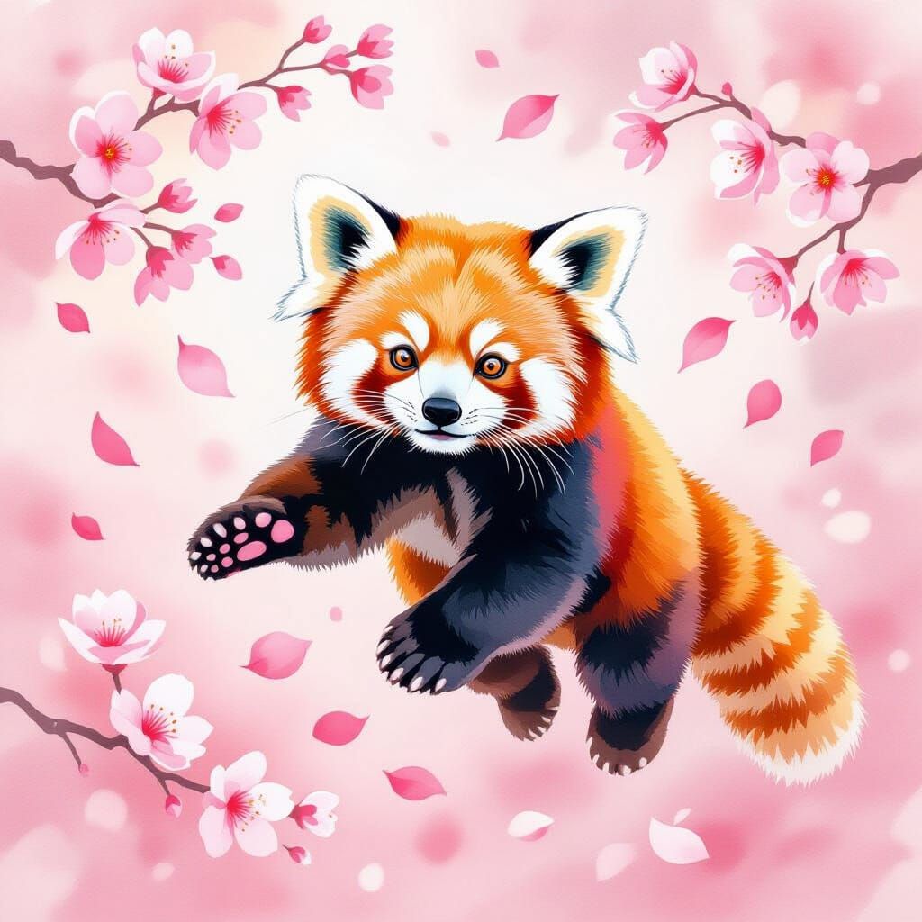 This image shows a playful red panda jumping through falling cherry blossom petals. Rendered in a soft, wet-on-wet watercolor technique with delicate brush strokes, it evokes a whimsical atmosphere.