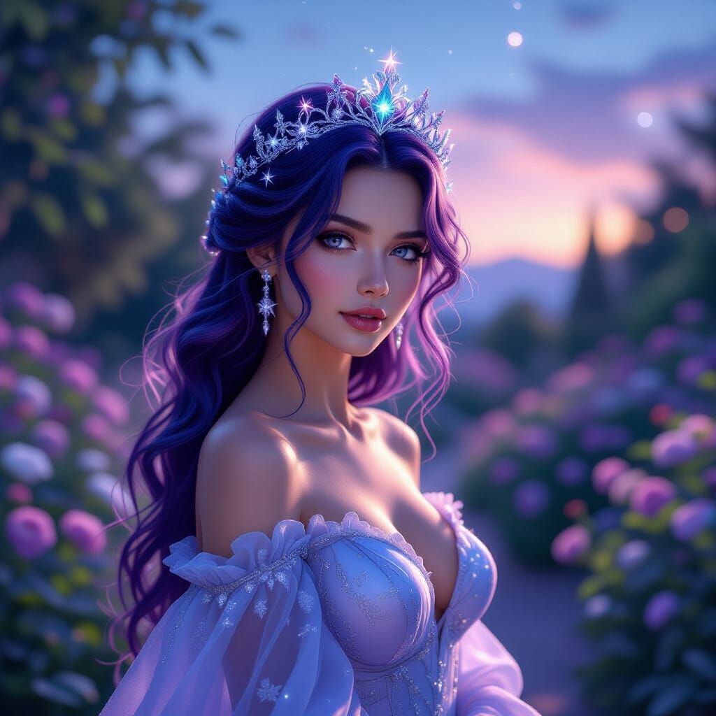A stunning image of a celestial queen with flowing amethyst hair and a starlight crown, set in a luminous twilight garden with galaxy eyes, rendered with soft ethereal light and ultra-real textures.