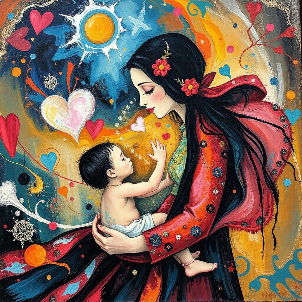 A vibrant abstract artwork celebrating motherhood. Swirling patterns and vibrant colors evoke complex emotions, drawing inspiration from surrealist, expressionist, and gothic art styles.