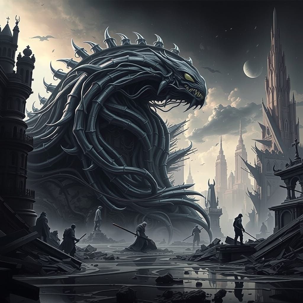 A towering symbiote ninja emerges amidst apocalyptic ruins. The creature's form is a mass of dark tendrils and growths, set against a backdrop reminiscent of gothic fantasy and biomechanical art.
