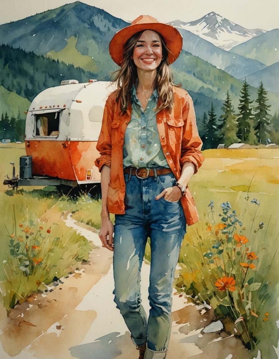 A cheerful woman stands in the Appalachian mountains with a trailer visible in the background. The artwork features visible brush strokes and watercolor effects, in an impasto style.