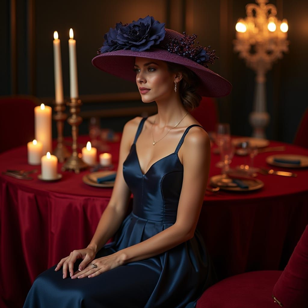 Em um ambiente de luxo e sofisticação, uma mulher está sentada elegantemente sobre uma mesa redonda coberta com uma toalha rica e detalhada. Ela usa um vestido de várias cores nobre aleatorias escuro, com um corpete justo que se ajusta perfeitamente à sua figura, revelando um toque de glamour e poder. ...