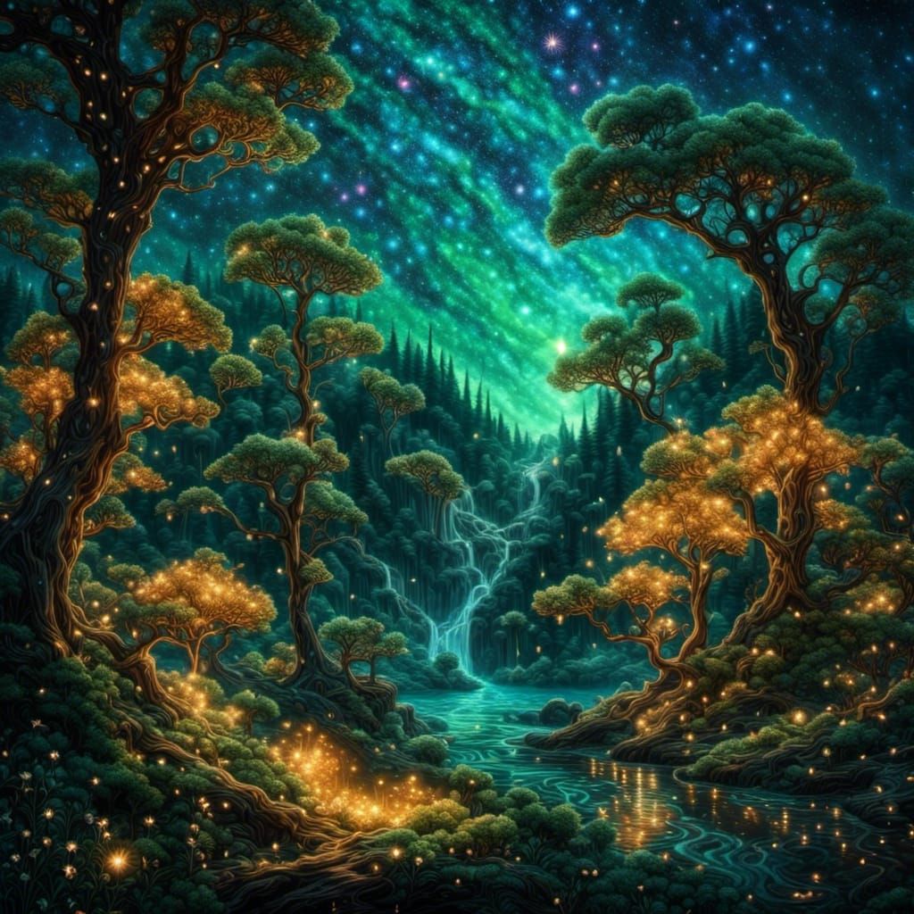 <lora:Imagination sparkle:1.0> “A divine realistic landscape of trees in a forest dripping with nanosparkles encapsulated in dripping Amber, intricate details, HDR, beautifully shot, hyperrealistic, sharp focus, 64 megapixels, perfect composition, high contrast, cinematic, atmospheric, moody”
