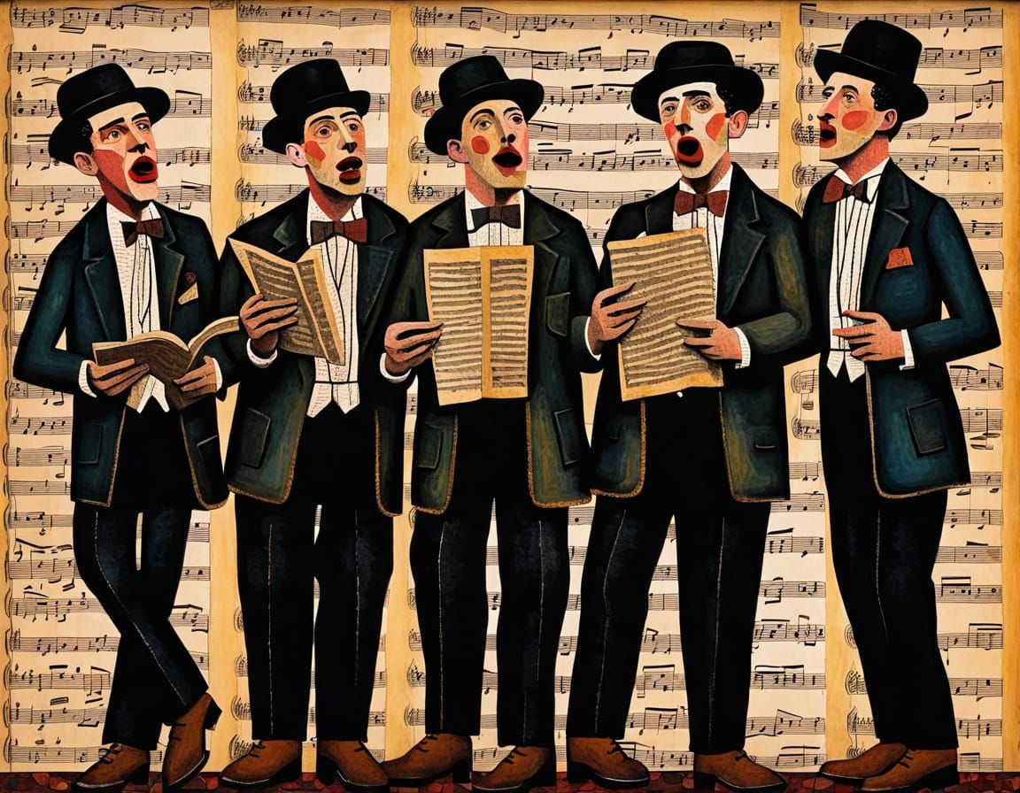 This image shows a barbershop quartet on stage, surrounded by the dark, moody colors and folk art elements reminiscent of Howard Finster's style, blending 3D and collage art techniques in a unique, cubist-inspired masterpiece.