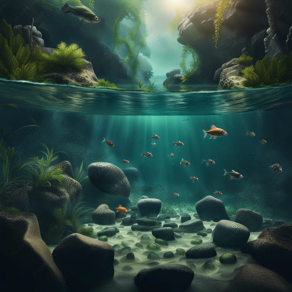 A vivid image of fish swimming among water plants and stones in crystal clear water. The image is a detailed digital painting with a cinematic and atmospheric feel.