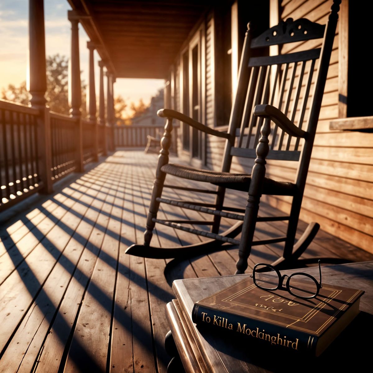 This image shows a vintage Southern porch at sunset with an ornate wooden rocking chair in warm light. A closed book and reading glasses sit on a table, creating a calm, reflective atmosphere with cinematic lighting.