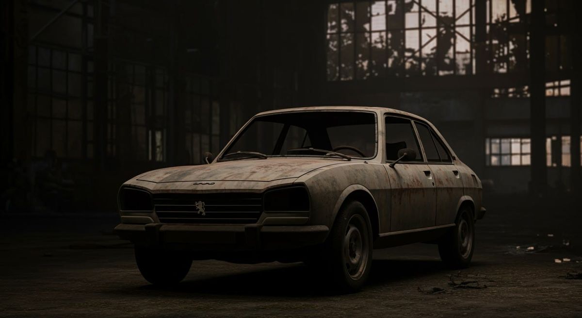 This image shows a rusty, stripped-down Peugeot 504 in an abandoned industrial space. The photorealistic rendering features stark lighting and burnished hues, highlighting the vehicle's decay in a cinematic style.